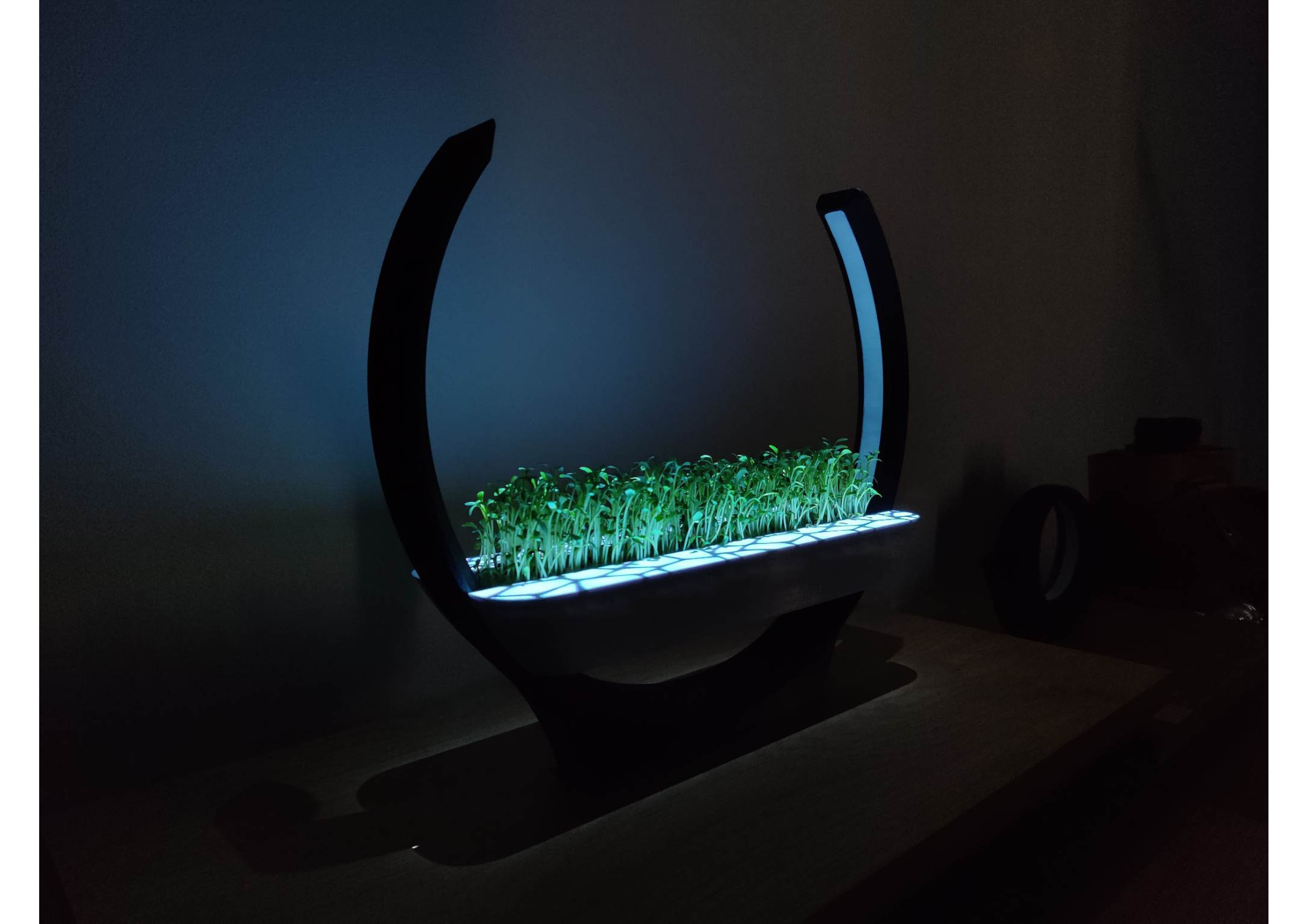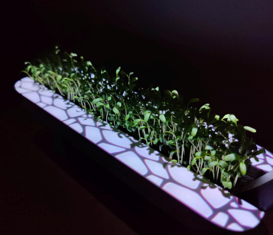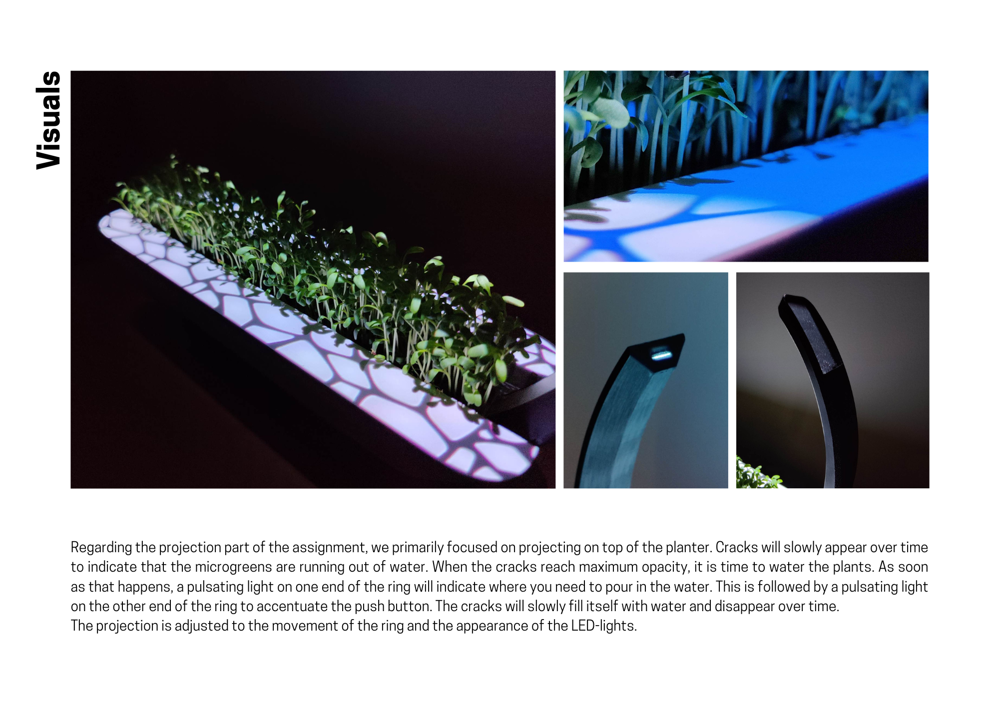 Regarding the projection part of the assignment, we primarily focused on projecting on top of the planter. Cracks will slowly appear over time to indicate that the microgreens are running out of water. When the cracks reach maximum opacity, it is time to water the plants. As soon as that happens, a pulsating light on one end of the ring will indicate where you need to pour in the water. This is followed by a pulsating light on the other end of the ring to accentuate the push button. The cracks will slowly fill itself with water and disappear over time. The projection is adjusted to the movement of the ring and the appearance of the LED-lights.