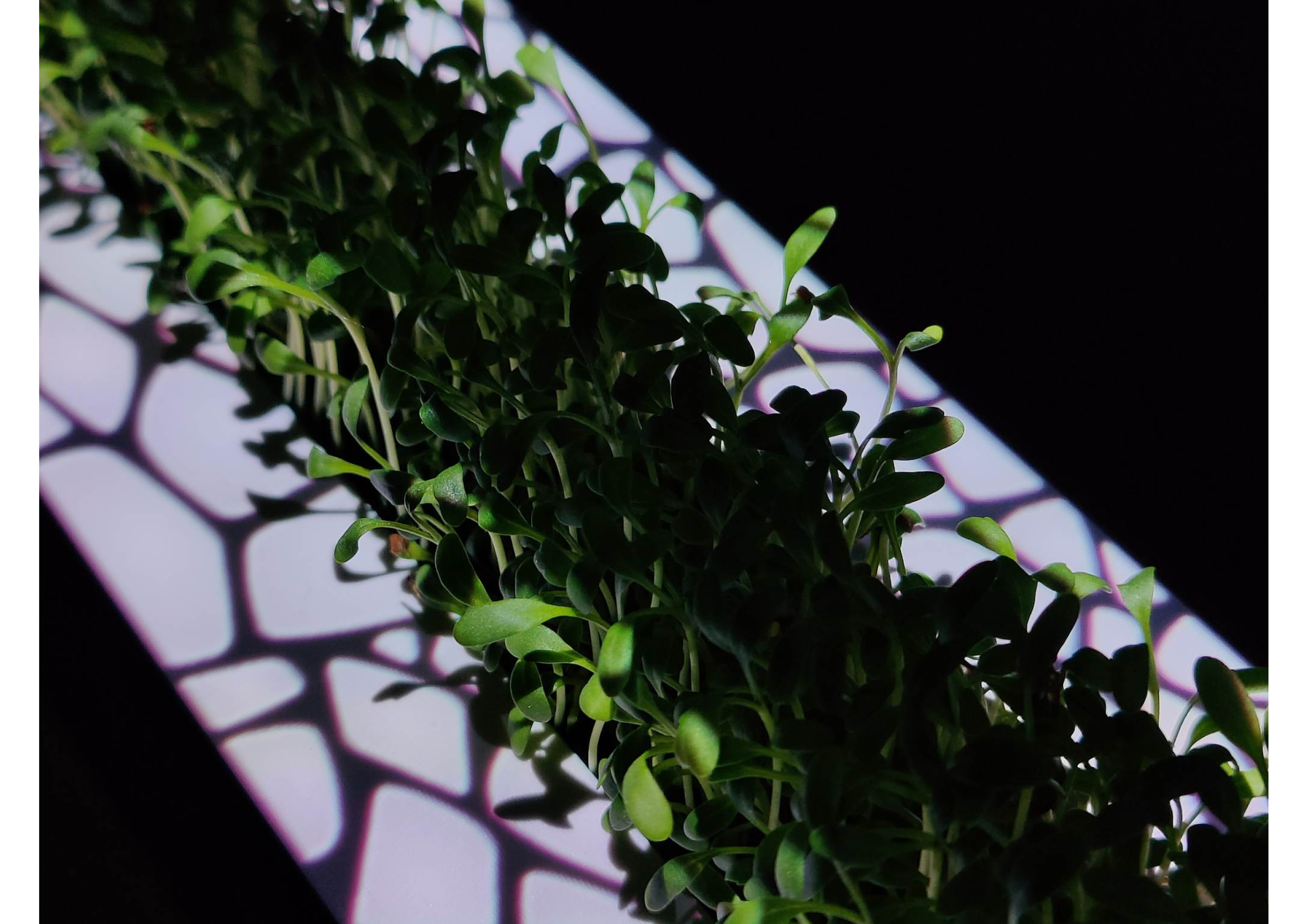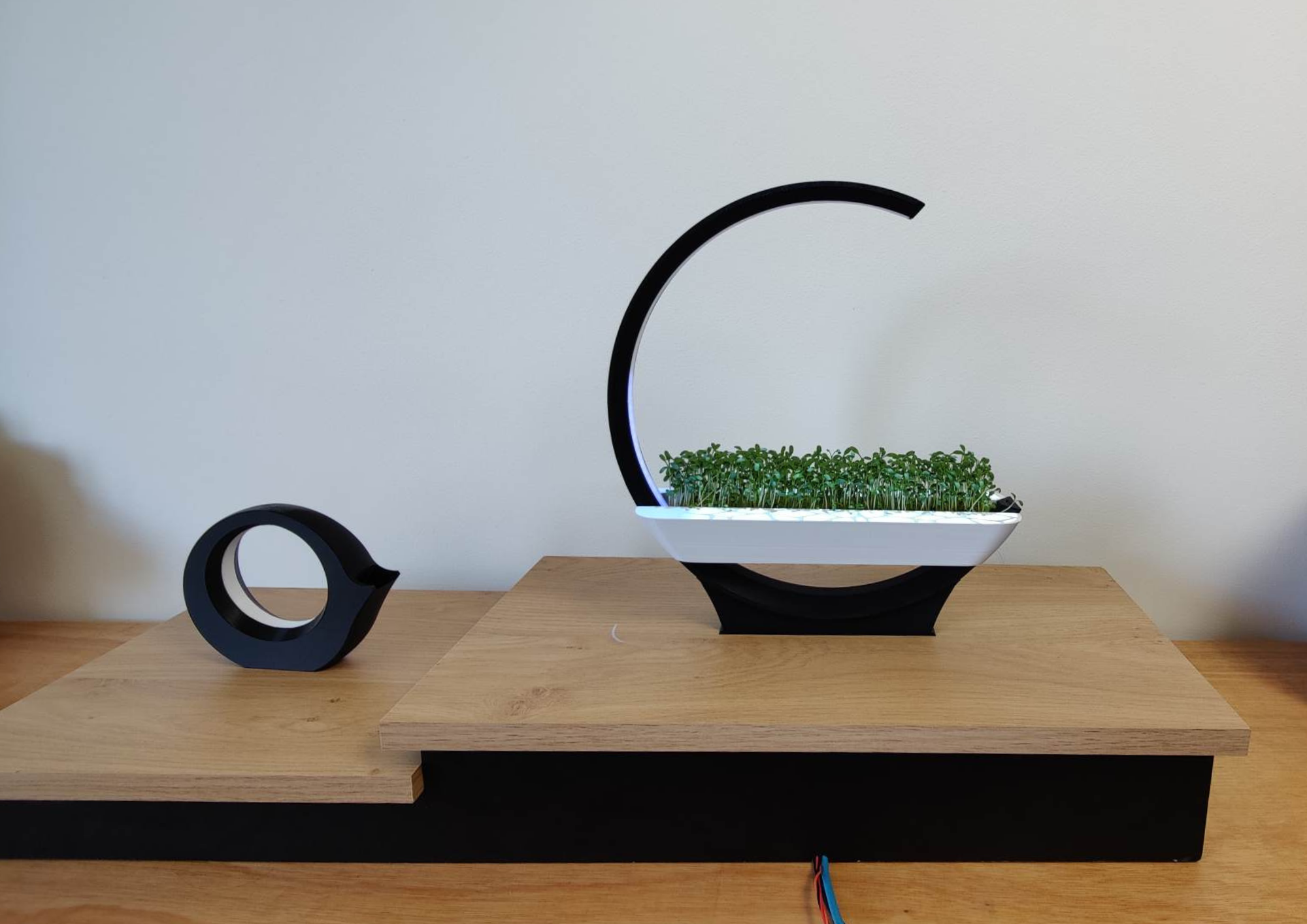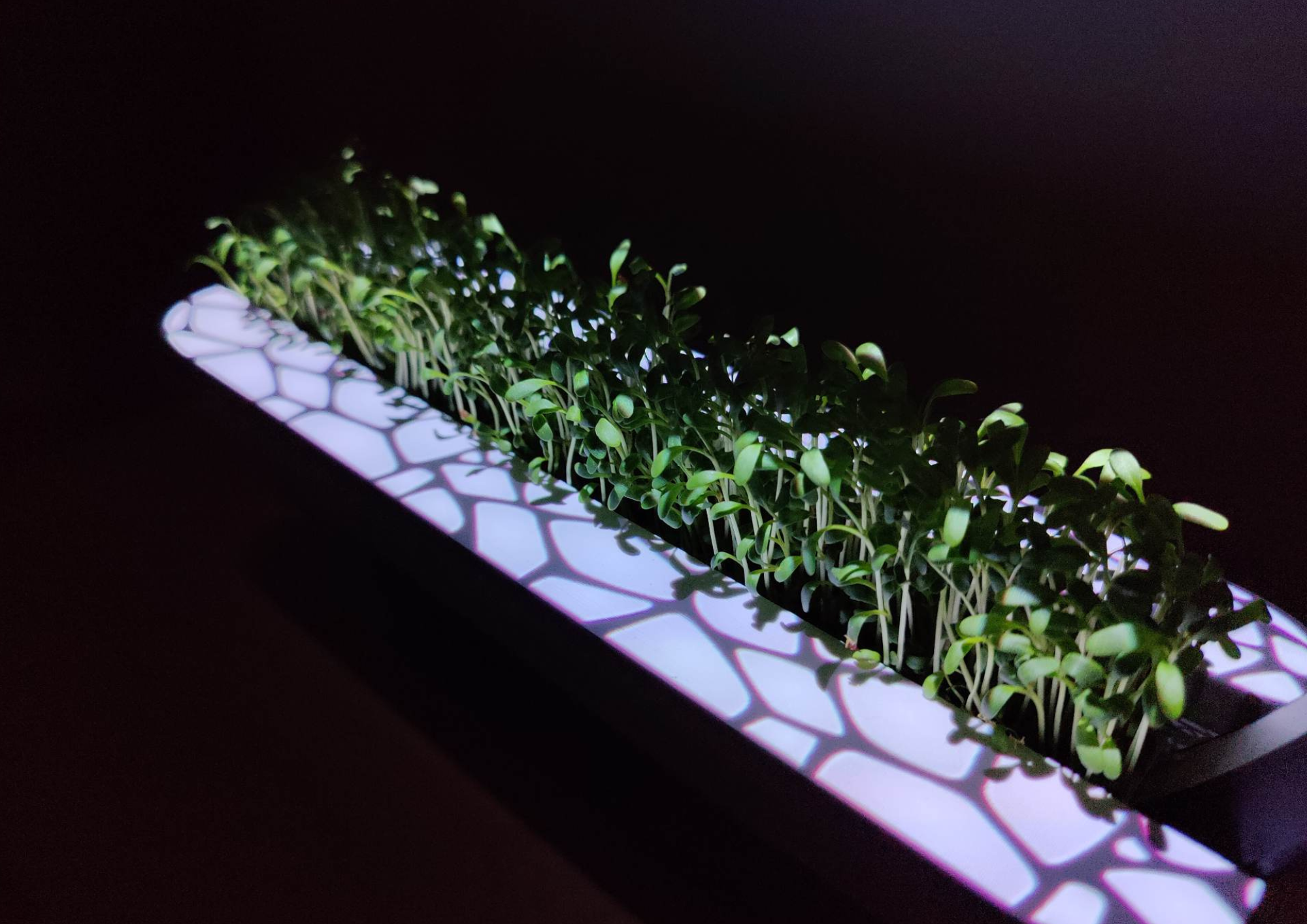 Regarding the projection part of the assignment, we primarily focused on projecting on top of the planter. Cracks will slowly appear over time to indicate that the microgreens are running out of water. When the cracks reach maximum opacity, it is time to water the plants. As soon as that happens, a pulsating light on one end of the ring will indicate where you need to pour in the water. This is followed by a pulsating light on the other end of the ring to accentuate the push button. The cracks will slowly fill itself with water and disappear over time. The projection is adjusted to the movement of the ring and the appearance of the LED-lights.