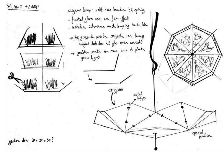 Our second concept was a hanging lamp that could open and close, providing access to the plants for watering or harvesting. The lampshade would be made of frosted glass/plastic, which would allow light to shine through. When the shade is closed, the light projected from above would function as a growing light for the plants. When the shade is lowered, the light shines on the countertop.