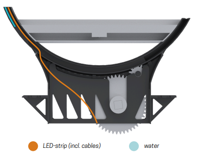 The water is stored behind the LED-strip, as well as on either side of it in provided channels.