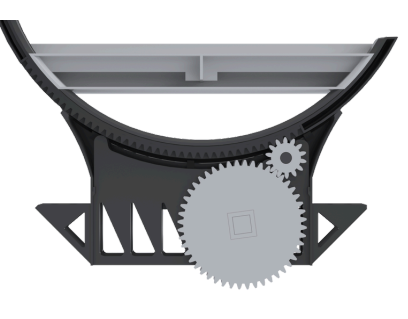 Gear teeth have been added to the outside of the ring on either side of the LED-strip. This way the ring is able to move in a more smooth and stable manner. To reduce the visibility of the gear teeth in the ring, an additional set of smaller spur gears were added. This opens up the opportunity to show less teeth on the left side of the ring. The smaller gears are connected to two bigger ones, that undergo a rotation of 250 degrees using a servomotor. This results in a 50 degrees rotation of the ring.